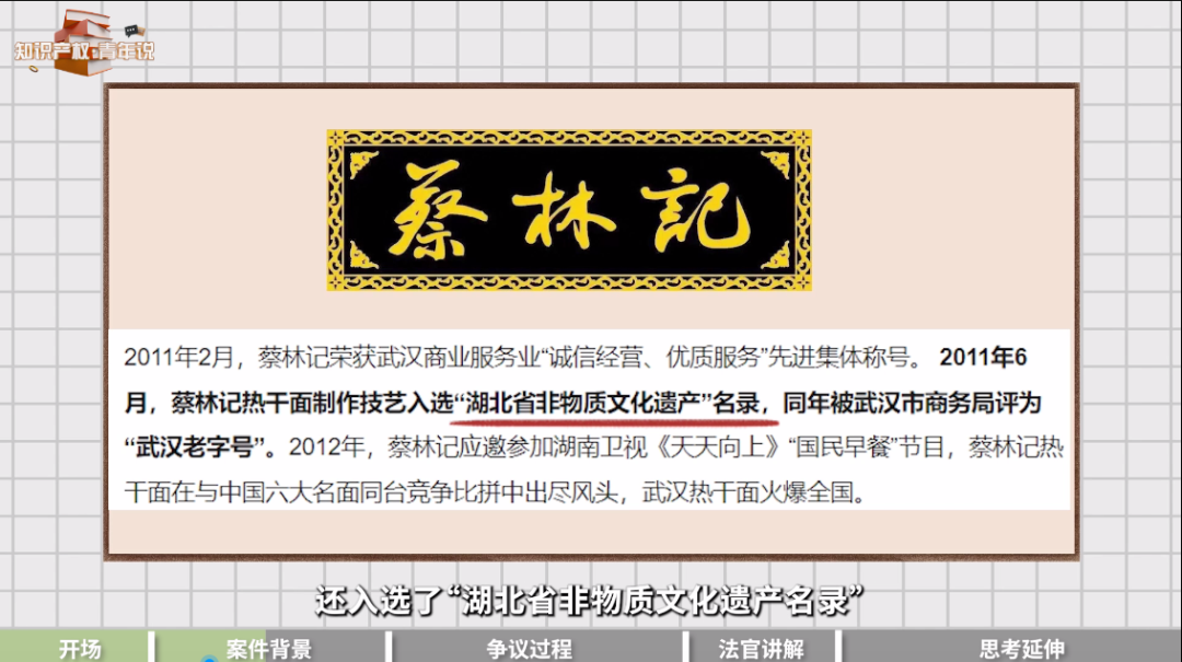 蔡林记公司进一步主张,血缘继承和技艺传承是不同的,根据公开资料显示,蔡汉文先生的身份是一名雕塑家,难以证明他传承了其父蔡明纬先生的技艺。而蔡林记公司不仅是“蔡林记”老字号品牌的权利人,也取得了热干面相关制作工艺技术,是正当的权利人,而且“蔡林记”已和蔡明纬家族无实际关联。