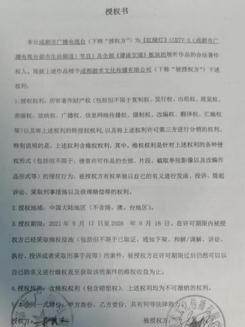 成都广播电视台授权成都游术文化传播有限公司进行维权